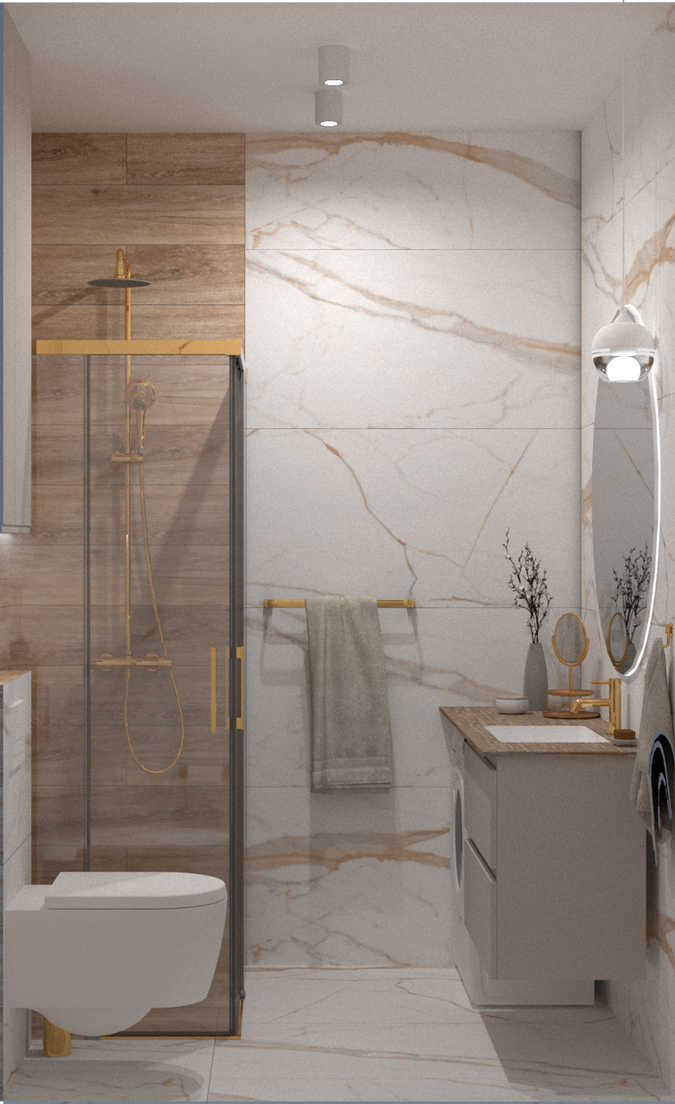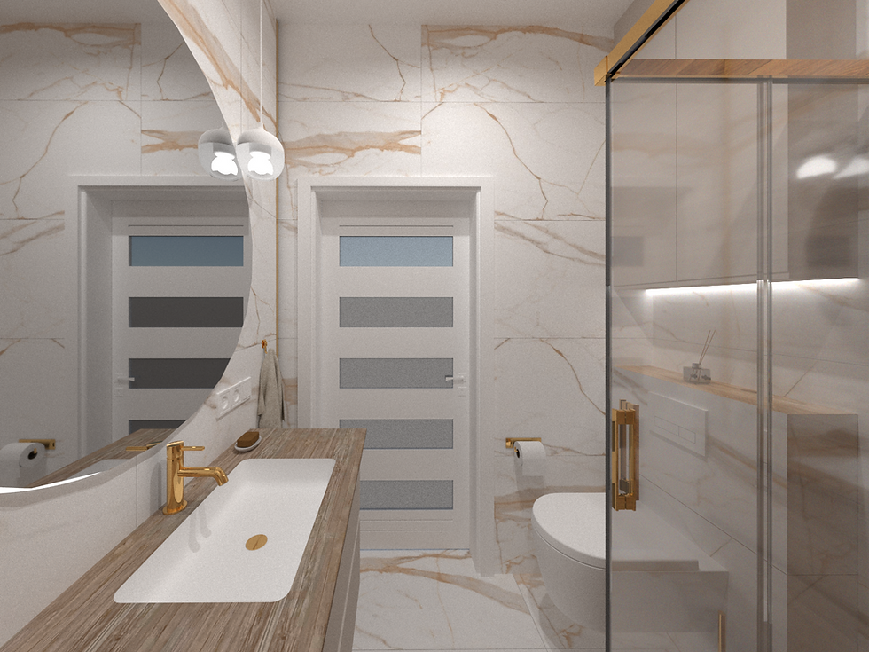 Nowoczesna łazienka w stylu premium to połączenie minimalistycznej elegancji z wyrafinowanym luksusem. Główną rolę grają tu wielkoformatowe płyty marmurowe w stonowanych, naturalnych odcieniach, których delikatne żyłki dodają przestrzeni charakteru. Subtelne złote akcenty pojawiają się w formie nowoczesnych kranów, uchwytów i oświetlenia, nadając wnętrzu dyskretny blask. Proste, geometryczne meble o gładkich powierzchniach zapewniają funkcjonalność, a ich kolorystyka harmonijnie współgra z marmurem. Całość uzupełniają inteligentne rozwiązania – podświetlane lustra, ukryte szafki i systemy przechowywania, które podnoszą komfort użytkowania. To przestrzeń, gdzie każdy detal jest przemyślany, a luksus wyraża się poprzez doskonałe proporcje, wysokiej jakości materiały i stonowaną kolorystykę.